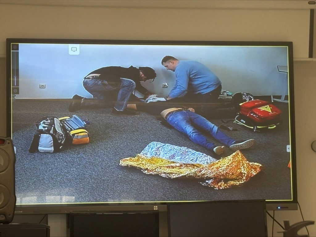 Velkým zážitkem pro nás byla výuka budoucích záchranářů. V jedné z učeben se nachází kompletní rekvizita sanitky, která věrně napodobuje reálné prostředí zásahu. Žáci zde po dvojicích sehrávají konkrétní situace, například vnitřní krvácení nebo nehodu motorkáře, zatímco jejich spolužáci sledují průběh naživo přes kamery z vedlejší místnosti.